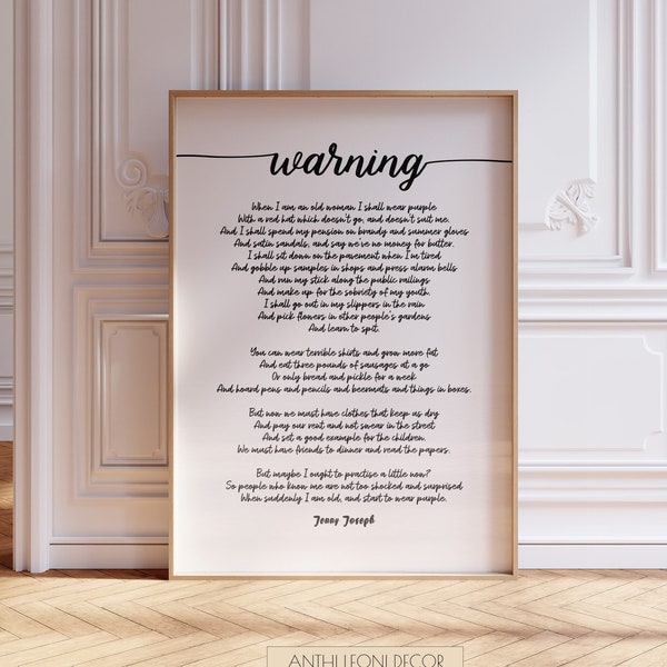 Warning Print by Jenny Joseph Warning Printable Poem by Jenny Joseph When I Grow Old I Shall. Summary 'Warning' by Jenny Joseph describes what the future has in store as one ages and throws off societal restraints and expectations And I shall spend my pension on brandy and summer gloves